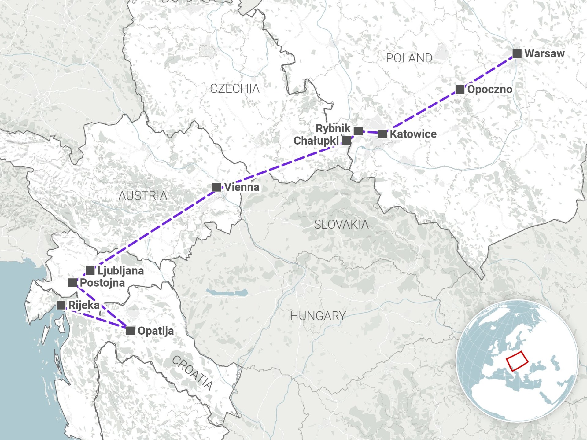 It will go through several cities en route, such as Opoczno, Katowice, Rybnik, Chałupki, Vienna, Ljubljana, Postojna, and Opatija.